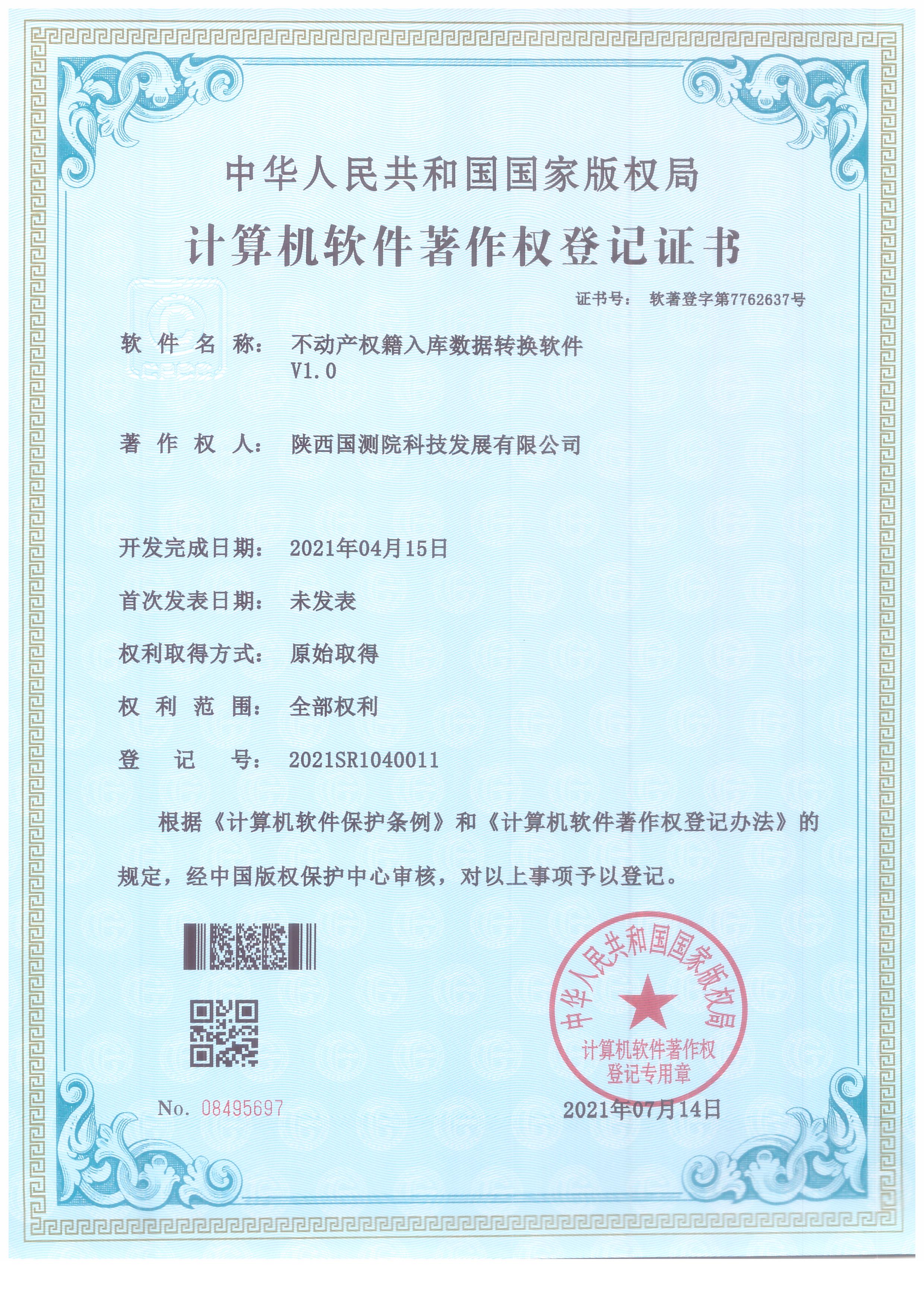 近日,根據(jù)《計算機(jī)軟件保護(hù)條例》和《計算機(jī)軟件著作權(quán)登記辦法》規(guī)定,經(jīng)中國版權(quán)保護(hù)中心審核,陜西國測院科技發(fā)展有限公司研發(fā)的“不動產(chǎn)權(quán)籍入庫數(shù)據(jù)轉(zhuǎn)換軟件V1.0”軟件技術(shù)獲得國家計算機(jī)軟件著作權(quán),被認(rèn)定為原始取得,受到中國版權(quán)保護(hù)中心的有效保護(hù)。
