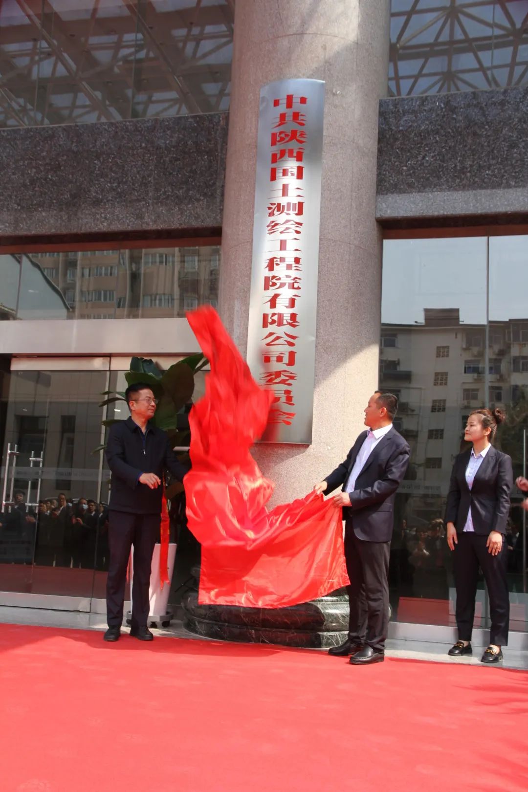 在雄壯的樂(lè)曲聲中,集團(tuán)公司黨委副書記安增會(huì)、測(cè)繪院黨委書記、執(zhí)行董事、總經(jīng)理馮永強(qiáng)共同為“中共陜西國(guó)土測(cè)繪工程院有限公司委員會(huì)”、“陜西國(guó)土測(cè)繪工程院有限公司”揭牌。馮永強(qiáng)宣布陜西國(guó)土測(cè)繪工程院有限公司正式入駐地質(zhì)資料樓。