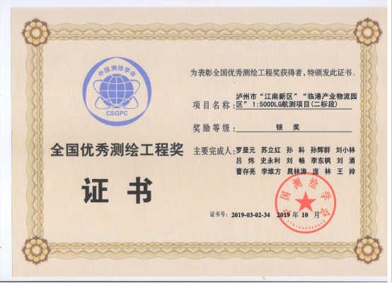 全國(guó)優(yōu)秀測(cè)繪工程獎(jiǎng)證書
