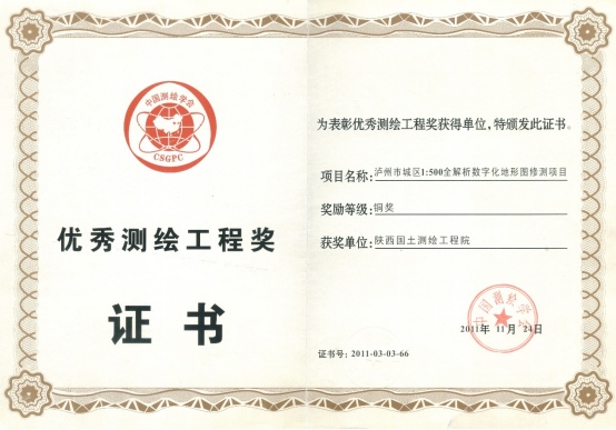 優(yōu)秀測繪工程獎證書