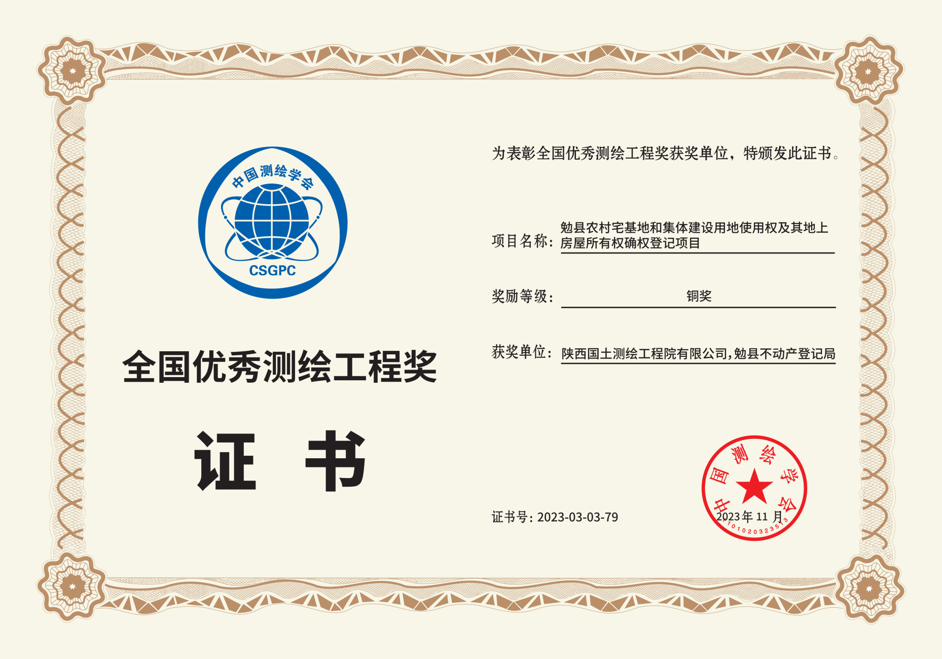 11月9日,第一屆中國測繪地理信息大會在浙江德清隆重召開,中國測繪學(xué)會 “2023年全國優(yōu)秀測繪工程獎”評選結(jié)果揭曉并舉行頒獎。陜西國土測繪工程院“勉縣農(nóng)村宅基地和集體建設(shè)用地使用權(quán)及其地上房屋所有權(quán)確權(quán)登記項目”獲得“2023年全國優(yōu)秀測繪工程獎銅獎”。這是自2019、2020、2021年連續(xù)三年奪得銀獎、2022年獲得銅獎后,第五次蟬聯(lián)全國優(yōu)秀測繪工程獎,本次獲獎充分證明了測繪院在測繪領(lǐng)域的卓越實力。